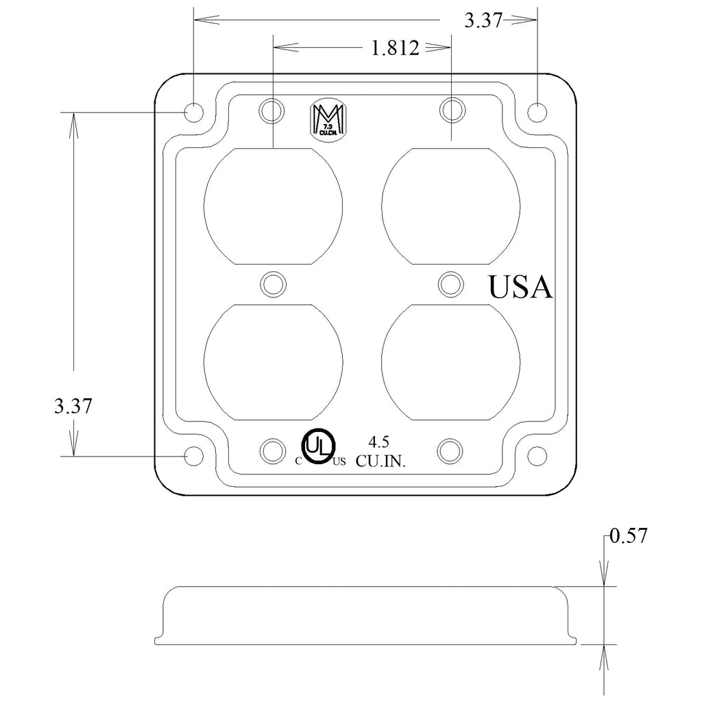 4 inch square cover, raised 1/2 inch, (2) duplex receptacle in gray powder coat finish.